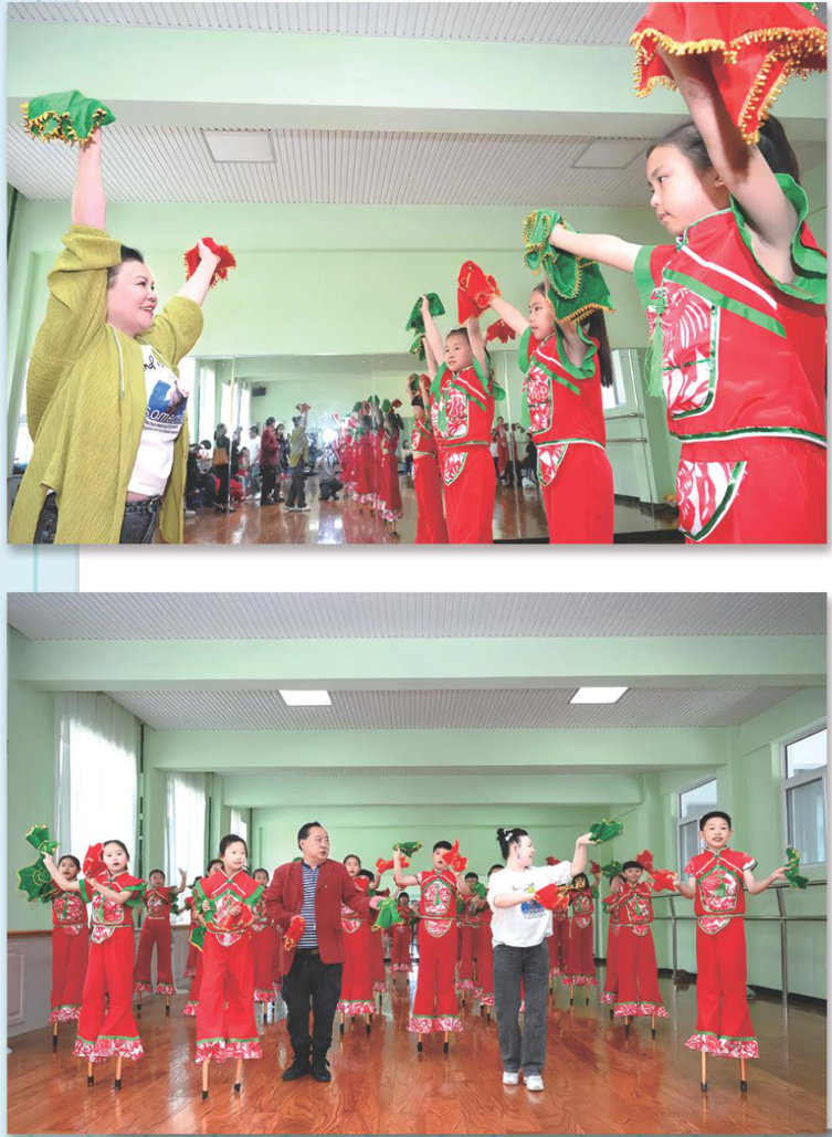 操场上,十几个孩子踩着两尺多高的木跷,时而优雅起舞,时而翻转腾挪;忽然两人腾空跃起,在半空中完成漂亮的交叉翻腾,最令人惊叹的是,六个人配合默契,摆出“孔雀开屏”的造型,引得现场掌声雷动一一这是娃娃高跷队的日常训练场景。 娃娃高晓队成立于2024年,共有46名队员,平均年龄只有8岁。作为“非遗进校园”活动的重要举措,娃娃高晓队的组建得到了和的大力支持,为学校捐赠了35副娃娃晓。每个周末,海城高晓国