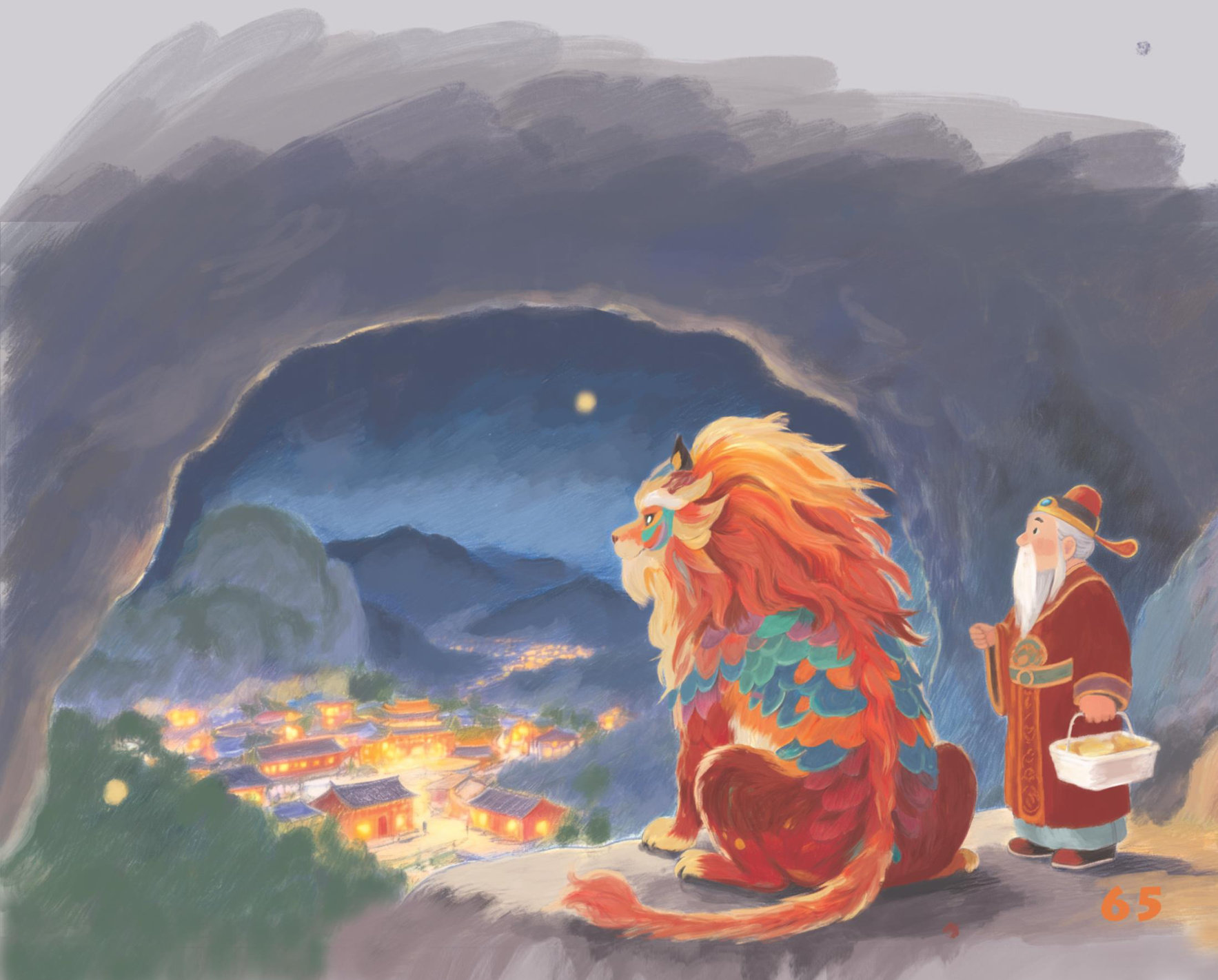 真热闹啊!”年兽趴在洞口,眺望着山下灯火通明的小镇,圆溜溜的眼睛里满是羡慕与落寞。 自从当年被人们赶跑后,它就一直待在这个光秃秃的石洞里,一待便是几千年。 “怎么了,想去人间耍耍?”土地公公给它送来了年夜饭,“我劝你还是趁早打消这个念头。当年你到处捣乱,大伙儿才用爆竹、春联对付你。这几千年好不容易太平了,你一露 面,人间不又乱套了?” “那都是我年少不懂事嘛。"年兽红着脸喃喃道,“我早就知