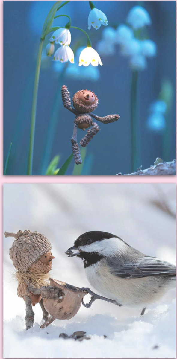 如果你看到这样的场景,一定会忍不住瞪大双眼:一颗颗橡子仿佛被赋予了生命,向我们展现着精灵世界的奇妙—这便是美国艺术家大卫·M.伯德打造的橡子人童话世界。 大卫·M.伯德曾任职于丹麦乐高公司,担任玩具设计师,他很喜欢用抽象的零部件来创作玩具角色。为了有更多时间陪伴家人,他放弃了这份热爱的工作。一次清扫庭院车道时,他偶然发现一根树枝酷似虫子的脸,望着脚下堆积的橡子果壳与树枝,一个念头油然而生:为