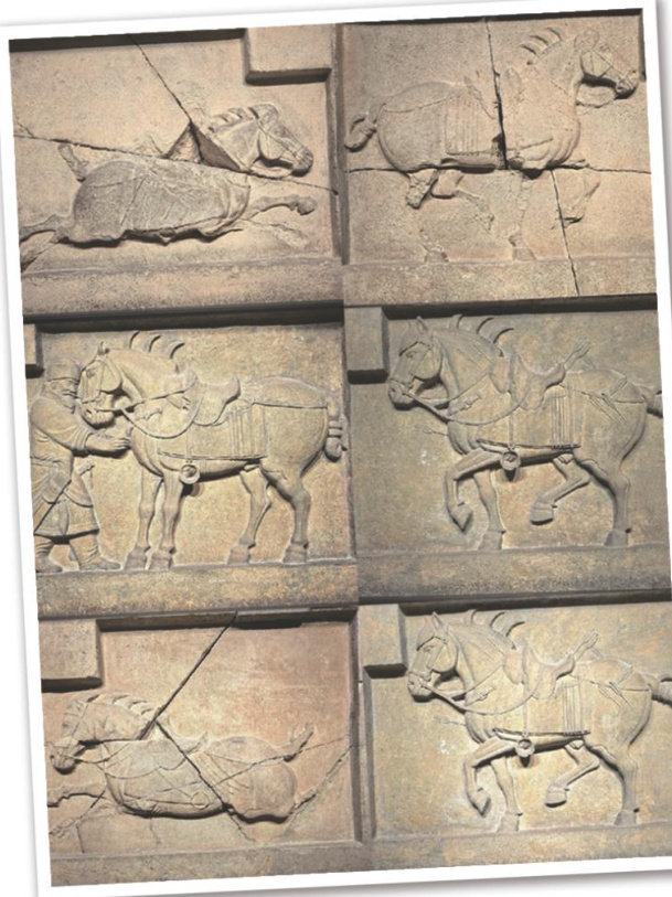 昭陵六骏浮雕,因年代久远,唐太宗撰写的赞语现已风化不存。 “昭陵六骏"是指唐朝建立初期,陪伴唐太宗李世民征战沙场、出生入死,立下汗马功劳的六匹战马,它们的名字分别为“白蹄乌"“特勒骠”“讽露紫"“青骓"“什伐赤"和“拳毛”。李世民曾骑乘这几匹骏马南征北战、冲锋陷阵,与它们结下了深厚情谊。唐贞观十年(公元636年),李世民着手为自己修建皇陵一一唐昭陵时,回忆起年轻时的征战岁月,以及这些与自己共