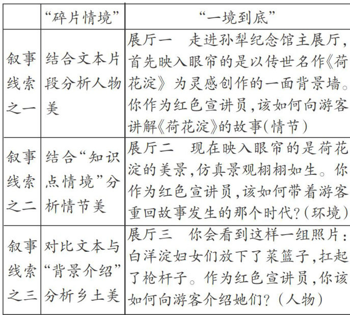 摘要:“碎片情境”在实际教学过程中存在诸多问题,借鉴影视领域的“一镜到底”构建学习任务群以期取得突破。“一境到底”坚持统整模型,在沉浸式的教学中走进学习情境;坚持主体关照,在指向性的任务中走向学习深入。文章以《荷花淀》教学实践为例,探索“一境到底”下教学评一体化的教学模式。