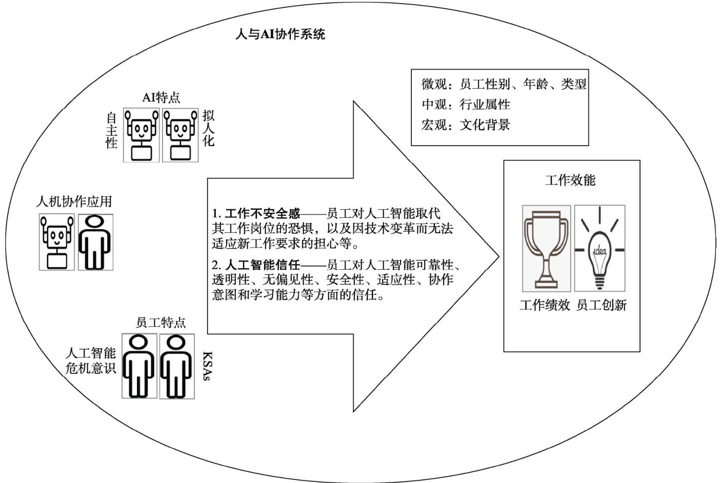摘要人工智能的快速发展深刻改变了社会结构和生产模式,其在组织中的应用对员工工作效能的影响获得了学者们的密切关注。为探讨人与AI协作系统对员工工作效能的影响及其机制,本研究对79篇国内外文献的106个独立样本 (n=54726) 进行了元分析。研究发现:人机协作应用、AI自主性、AI拟人化及员工KSAs(知识、技能和能力)对员工工作效能有正向影响,表现为“机会”;而人工智能危机意识则产生负向影响,被视为“威胁”。人工智能信任和工作不安全感在人与AI协作系统和员工工作效能的关系中发挥中介作用,进一步阐释了“机会”与“威胁”双路径。并且,员工类别、行业属性和文化背景具有一定的调节作用。研究结论表明人与AI协作系统具有双刃剑效应,既可以通过人工智能信任提升员工工作效能,也能够通过工作不安全感降低员工工作效能,且积极效应强于消极效应。本研究在资源保存理论的框架下,明晰了人与AI协作系统对员工工作效能的影响机制及其边界条件,为组织正确看待人与AI协作系统带来的影响,有效发挥AI价值提供指导。