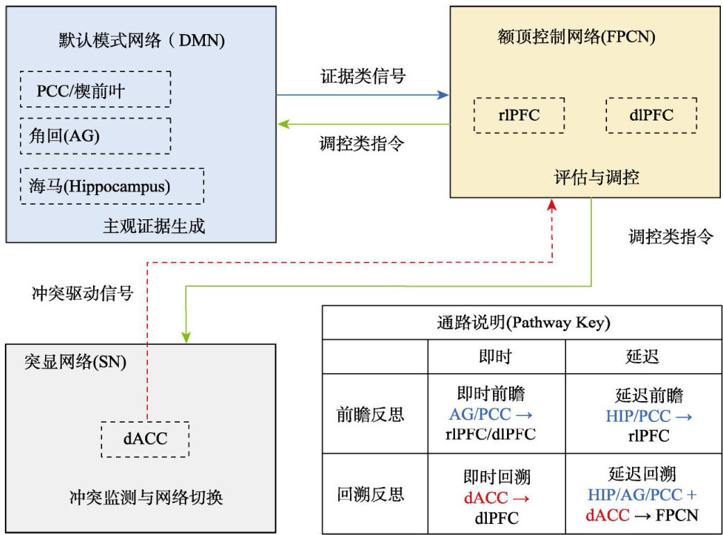 摘要元认知反思是自主学习和高阶思维发展的核心机制,其神经基础已成为认知神经科学与教育科学交叉领域的重要议题。然而,现有研究尚缺乏能够系统解释不同类型反思的神经特异性及其网络协同机制的统一框架。本文首先梳理了元认知反思的核心成分,并提出一个前瞻/回溯与即时/延迟相结合的二维分类框架。在此基础上,系统回顾了前额叶、顶叶和扣带回三大关键脑区的功能证据,并总结其在不同类型反思中的作用。通过整合空间网络与时间动态的研究成果,本文进一步提出特异性-协同模型,强调大规模脑网络的动态交互既体现不同类型元认知反思监控的神经通路特异性,也揭示跨网络的协同规律。最后,文章展望了未来在动态网络建模、生态效度提升和个体化干预等方向的研究前景,旨在为元认知反思的机制研究提供统一的理论框架,并为教育实践中的反思性学习提供新的神经科学视角。
